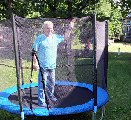 Die Schulung des Gleichgewichtssinn auf dem Trampolin ist für Herrn B. eine große Herausforderung mit hohem Spaßsfaktor! |